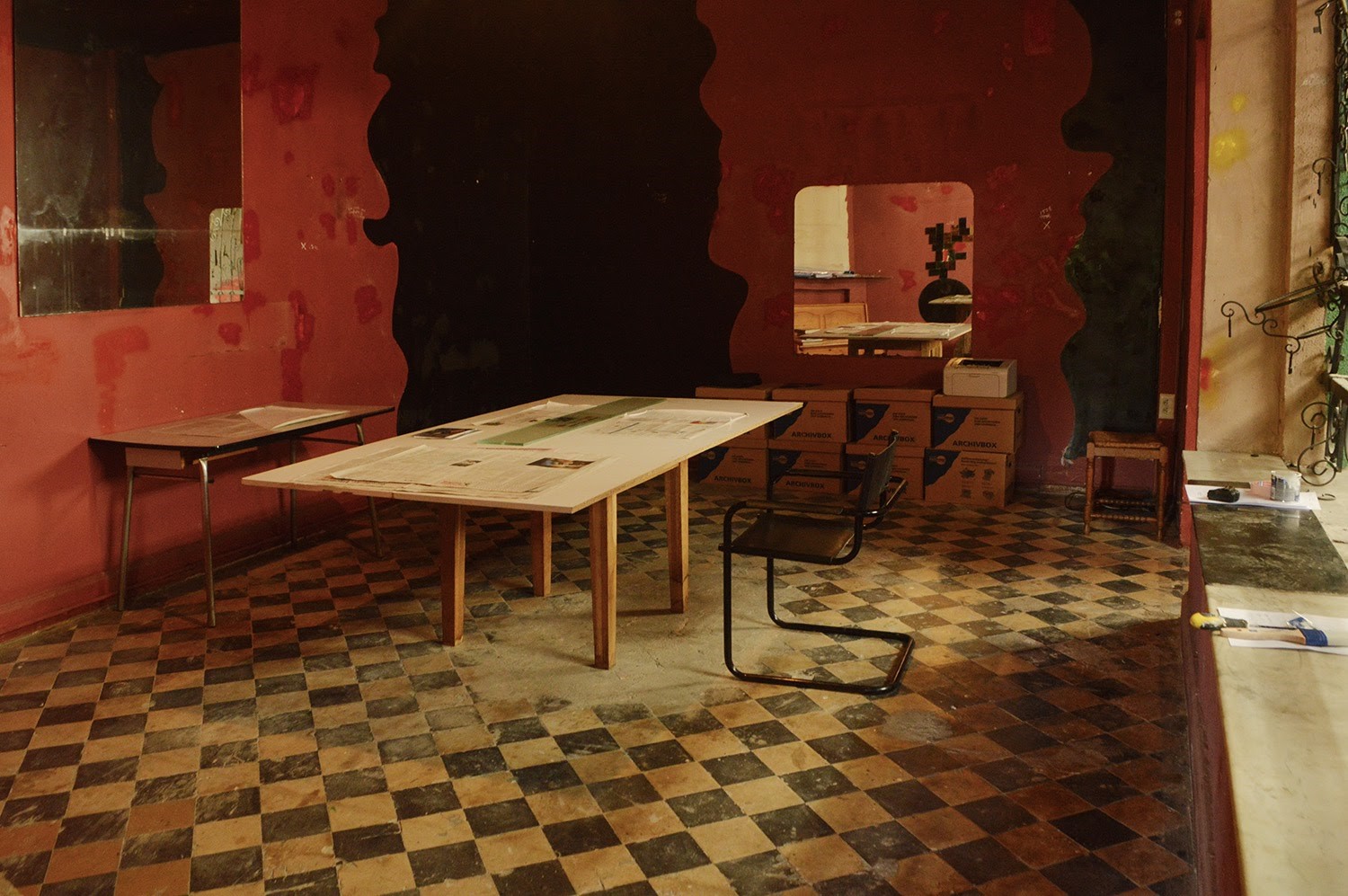 “Shared Atelier partagé” takes place inside the “Reactor”, central space of the former swingers club. An interior atrium with surrounding niches and balconies, a two-story vertical landscape. There are two independent working units with open balconies (each 32 m2), and one independent unit with closed balcony (24m2). In addition, there are common areas with kitchen, garden, toilettes.